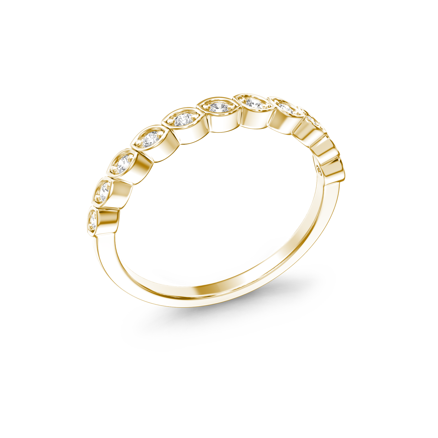 This 18k gold ring showcases a captivating design featuring 11 interconnected marquise shapes, each gracefully holding a round diamond in a pavé setting.