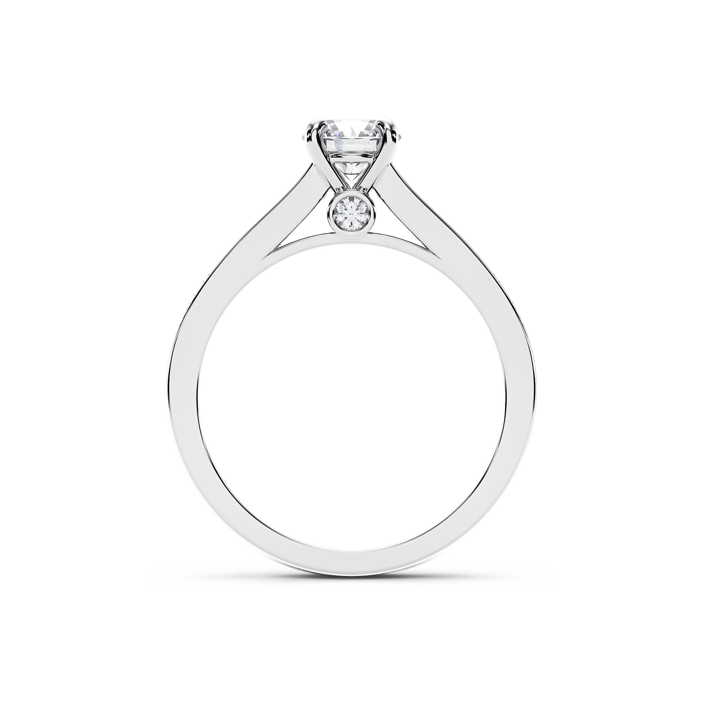 This exquisite 18k gold ring showcases a stunning 0.60-carat round brilliant diamond, securely held in a classic 4-claw basket setting. Beneath the basket, two additional diamonds, each weighing 0.06 carats, are set in sleek bezel settings, adding a touch of subtle sparkle.